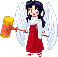 | 長い黒髪を後ろで話にしている巫女装束の少女、巫女なのに天使の羽根が生えている | ||||