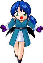 | 蒼いショートの髪と紫色の手袋、コウモリの羽根が特徴の少女 | ||||